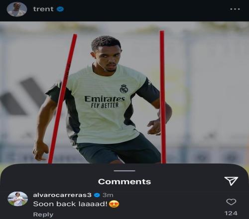 雷速体育10月15日宣 皇马球星阿诺德更新社媒:“很快回归”,在此前晒出的皇马训练照中,阿诺德已归队参加训练。