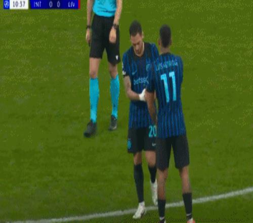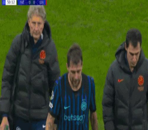 第11分钟,国际米兰遭遇伤病打击,恰尔汗奥卢肌肉受伤无法坚持,泽林斯基紧急出战。